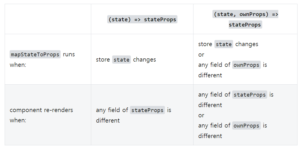 아래는 mapStateToProps의 매개변수에 따른 호출 조건이다.